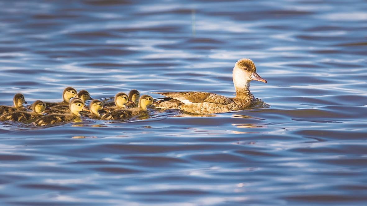 碧波荡漾的湖面上,鸟儿在悠然游弋。