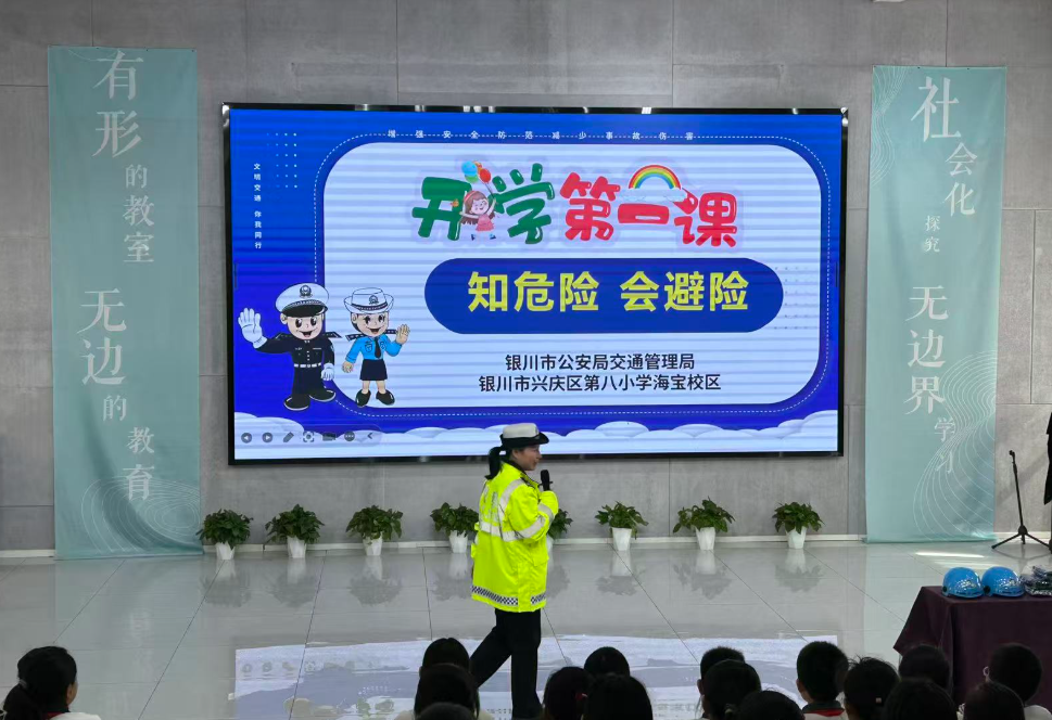 安全护航不缺位,兴庆区博文小学、实验第二小学海宝校区的教室里,传来互动问答声。“过路口走在哪?”“人行道!”“没有信号灯怎么过马路?”“一看二慢三通过!”交警结合日常出行场景,用通俗的语言讲解交通安全知识,真实的事故案例让孩子们神情严肃,纷纷表示会遵守交通规则。现场,交警示范标准的交通指挥手势,孩子们跟着抬手、转身,沉浸式学习,有奖问答环节更是将氛围推向高潮,孩子们踊跃举手、积极抢答,在欢声笑语中牢记安全常识,为平安上学路筑牢防线。