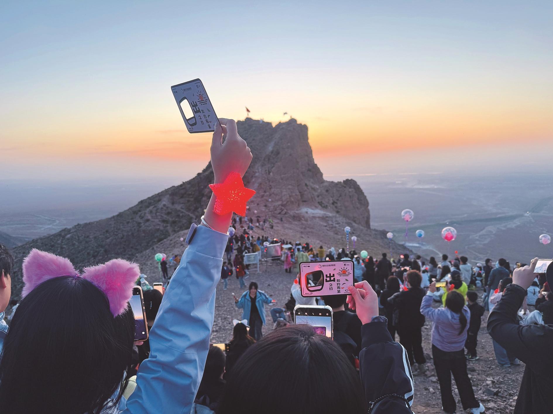在集合时,大家分别领取了一张“春日色卡”,正面印有贺兰山春日五种色调:新芽绿、岩壁赭、杏花粉、天空青、朝霞橙。入场登山后,大家随身携带可降解垃圾袋,践行环保守护贺兰山,踏上寻色之旅。东方渐亮,朝阳初升之时,歌声与晨光交织,“日出碰杯”环节温情上演,全体游客手持红酒杯、春日色卡与鲜花,以日出为背景,拍摄了一张充满仪式感的大合影,并在社群中开启了“我的春日一色”分享——大家纷纷写下今天最触动的颜色与此刻心情,让温暖在线上延续。