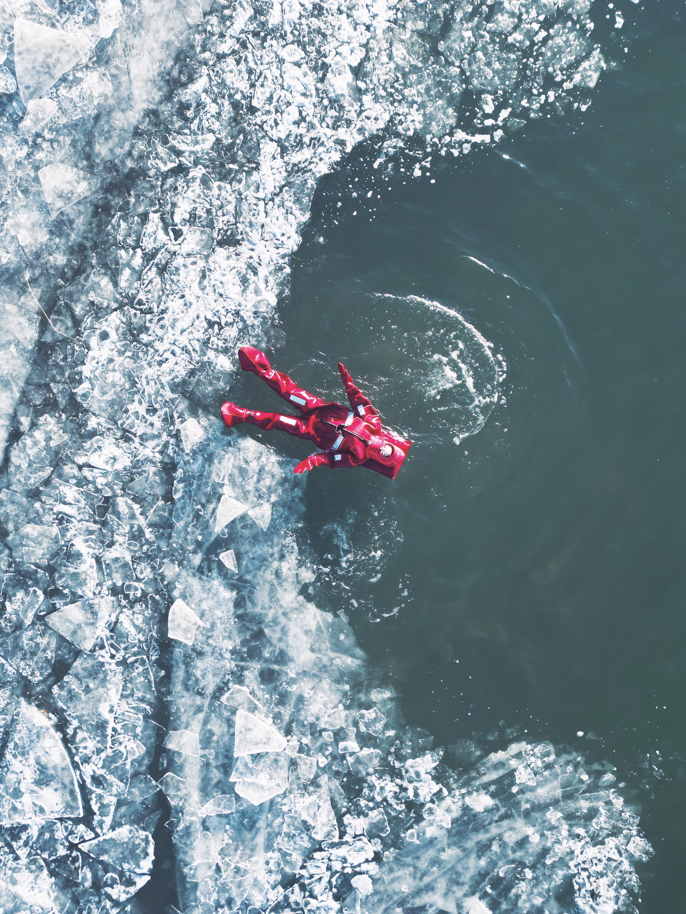 一人漂浮于冰面之上。
