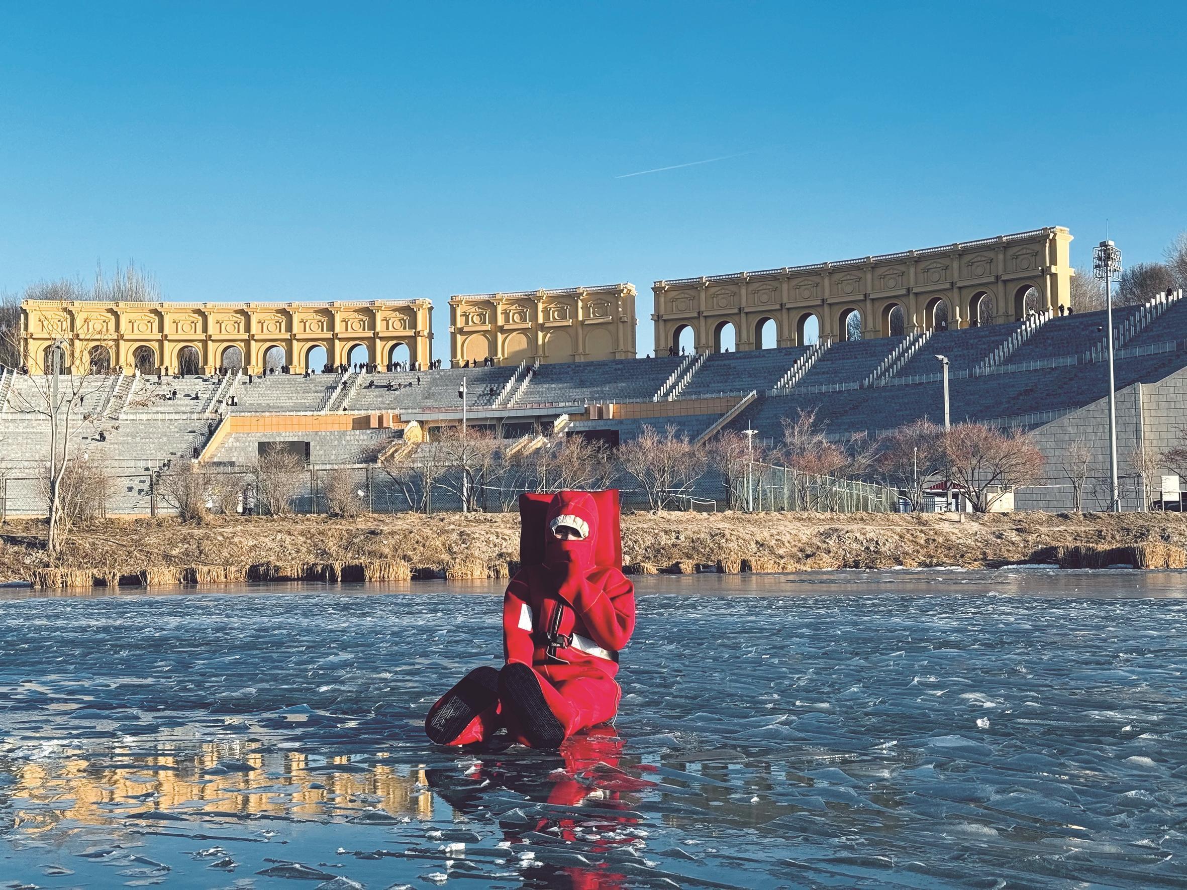 尽管冰浮项目以“漂浮”为主要体验,但玩法却不止于此。于晨程介绍:“虽然只能浮在水面,但还是有很多玩法,有一个人的玩法,也有多人一起玩的方法。我们有摄影师提供全方位的记录服务,以航拍和地面拍摄为主。航拍尤其受到欢迎,从天空俯瞰的视角,能够捕捉到冰湖、浮冰和‘小龙虾’服装构成的独特画面,这种视角是传统冰上活动难以获得的。”